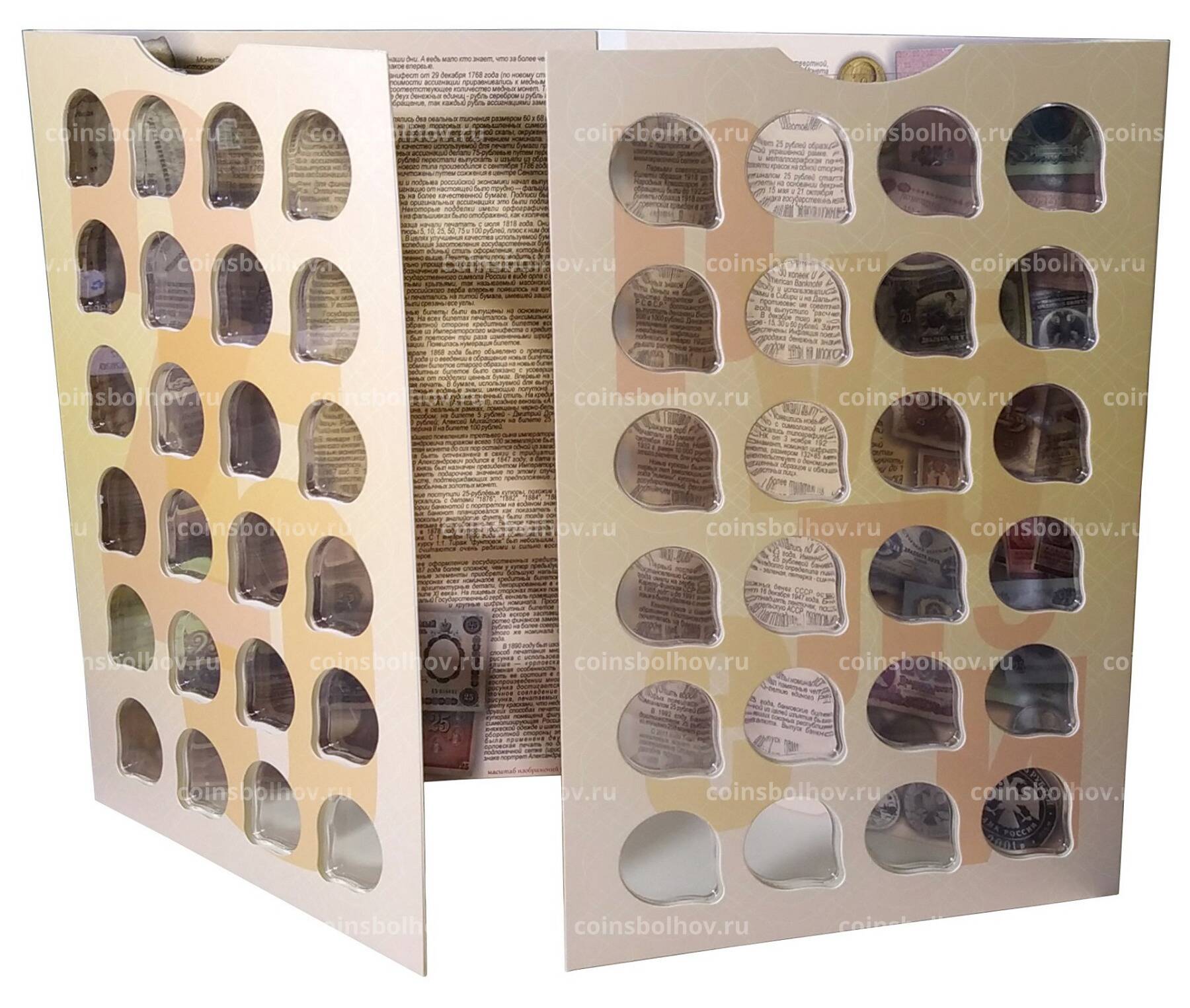 В альбоме 48 неподписанных ячеек для памятных и юбилейных монет номиналом 25 рублей. Можно разместить в альбоме любые монеты данного номинала в любой последовательности. Монеты в альбоме видны с двух сторон.