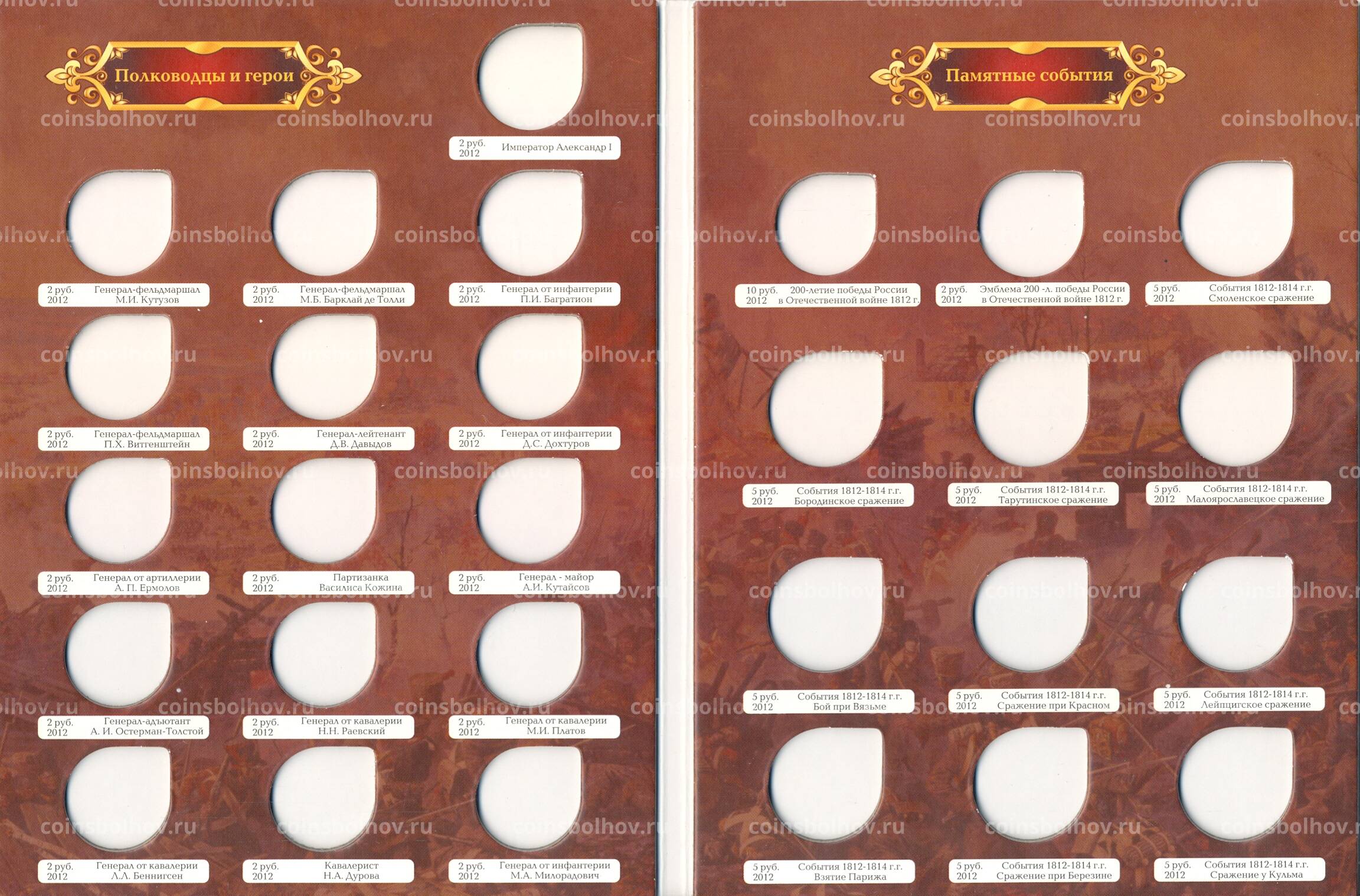 В альбоме ячейки под все монеты 2 и 5 рублей 2012 года серии ''Бородино'', а также 10 рублей 2012 года ''Арка''