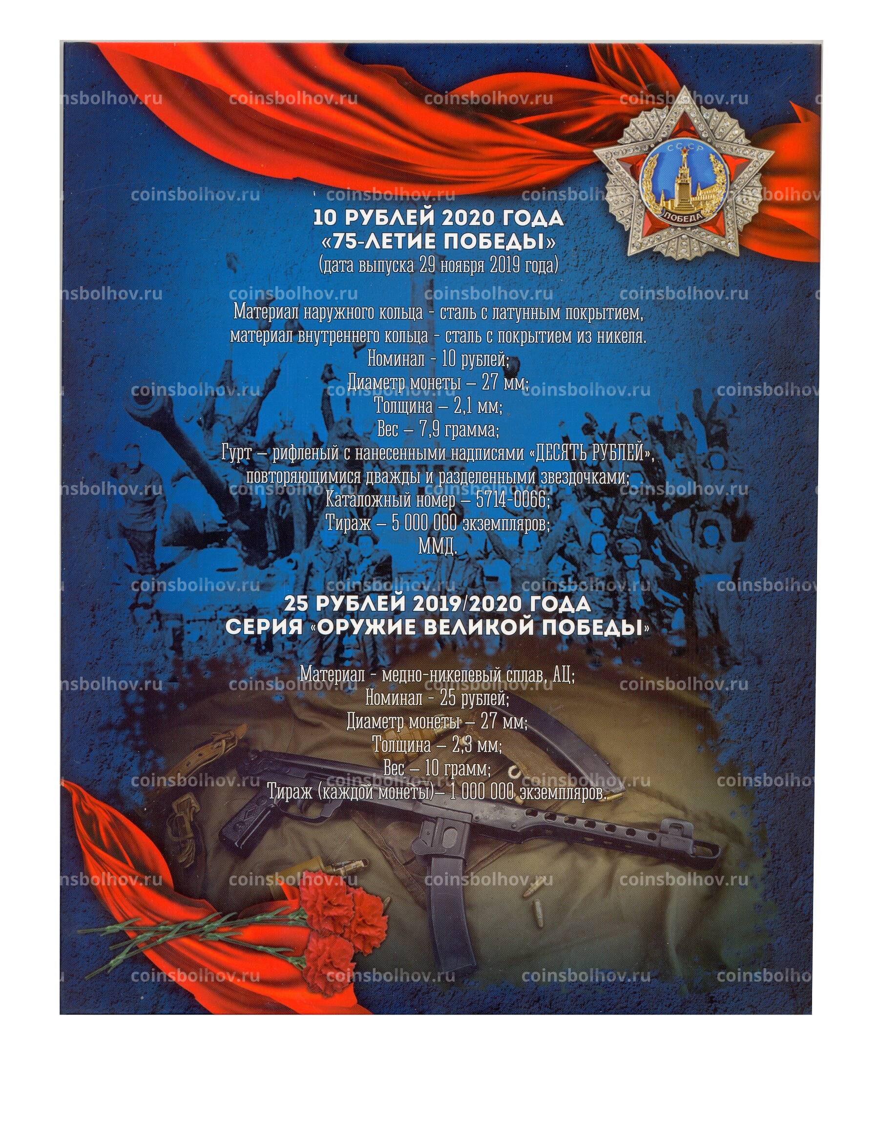 Альбом предназначен для монет номиналом 25 рублей «Оружие Великой Победы» и монеты номинлом 10 рублей 2019 года «75 лет Победы в ВОВ»