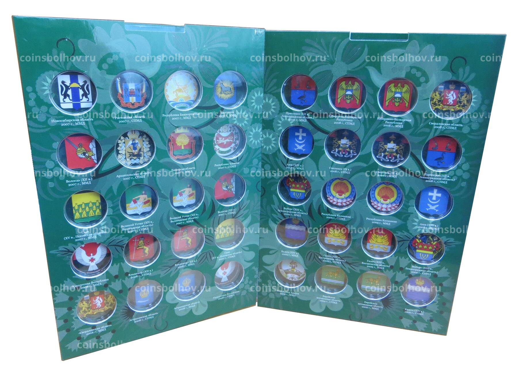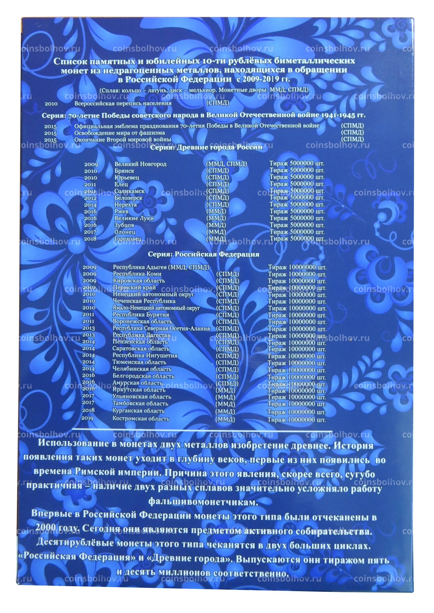 Комплект из 4 альбомов содержит ячейки для всех юбилейных и памятных биметаллических монет России номиналом 10 рублей выпуска 2000 — 2020 года с учетом монетных дворов, а также ячейки для последующих выпусков биметаллических монет.