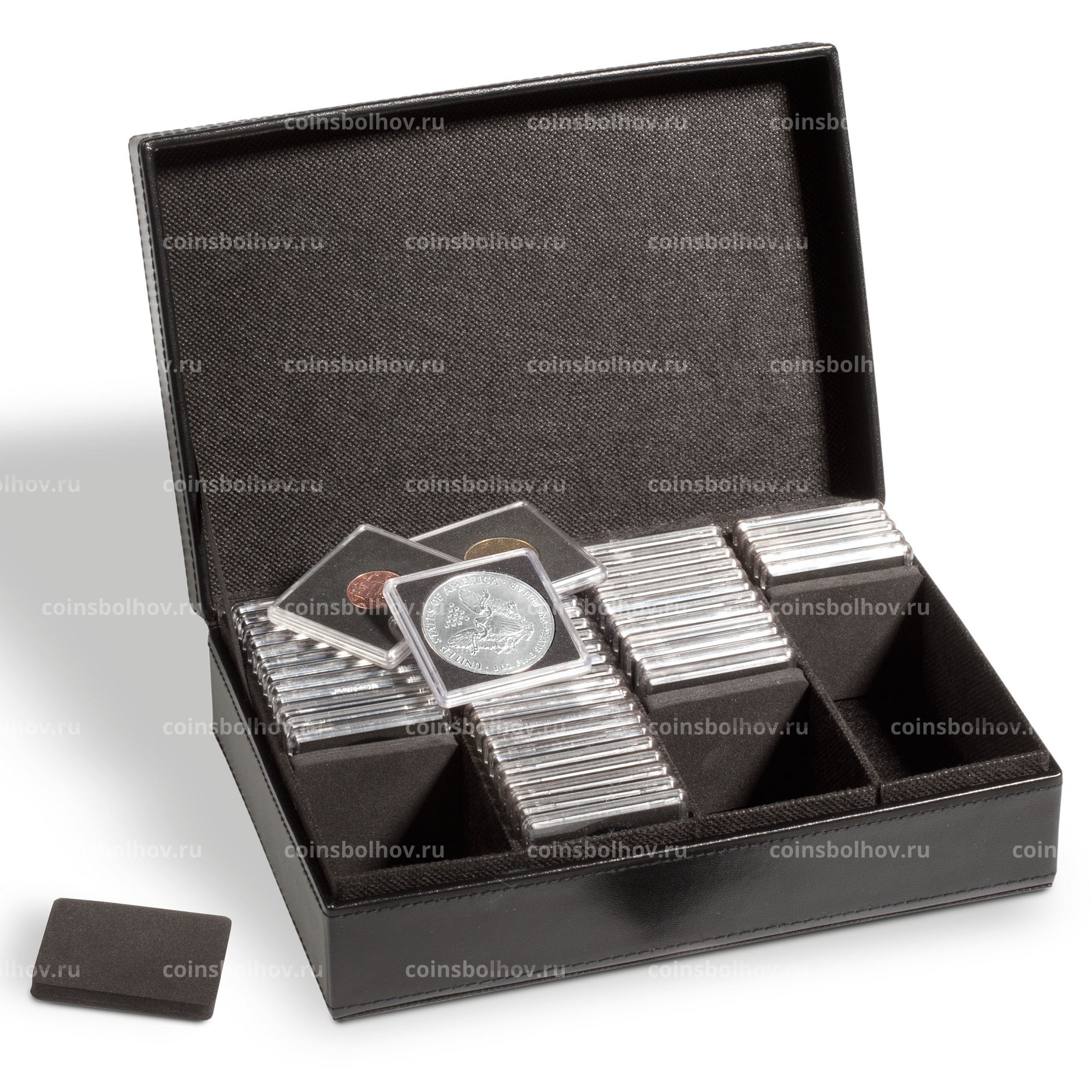Бокс на 100 монет в капсулах QUADRUM. Кожзаменитель (с набивкой). 4 «стопора» для удержания капсул (при неполном заполнении ряда). Габаритные размеры: 225х181х77 мм.