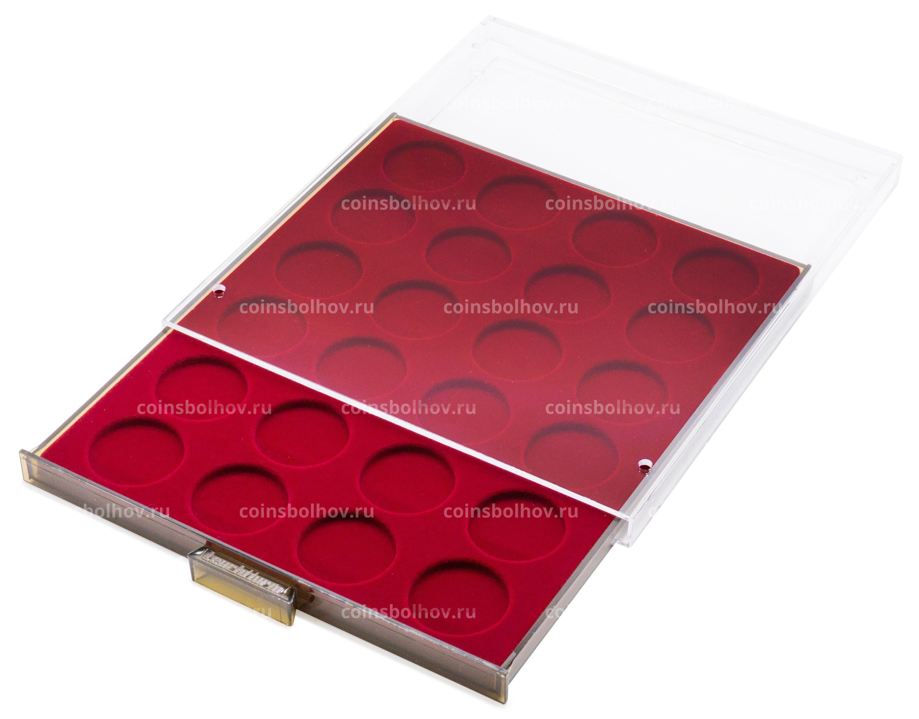 Внутренняя отделка: под красный бархат. Габаритные размеры: 236х303х20 мм. 24 круглые ячейки диаметром 41 мм.