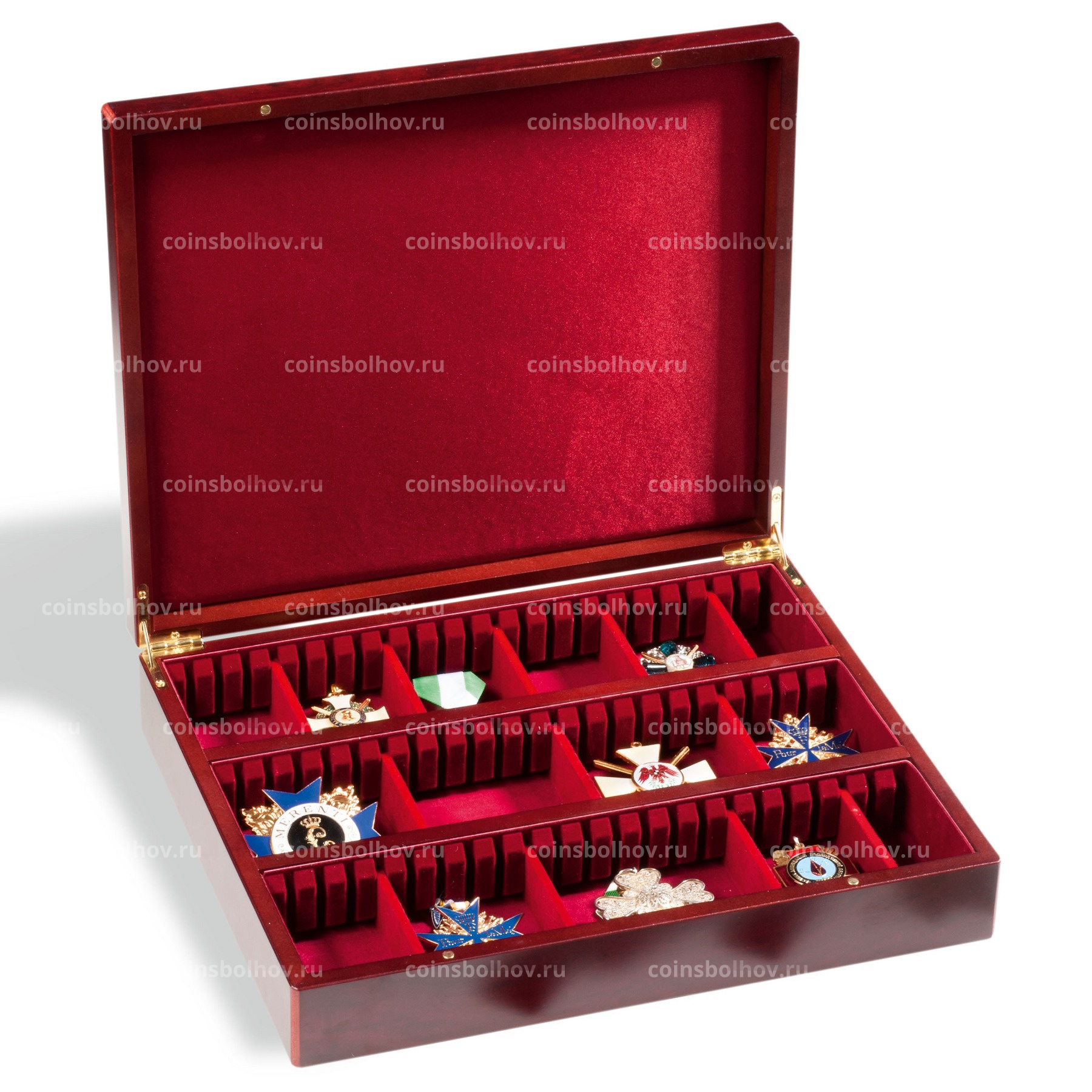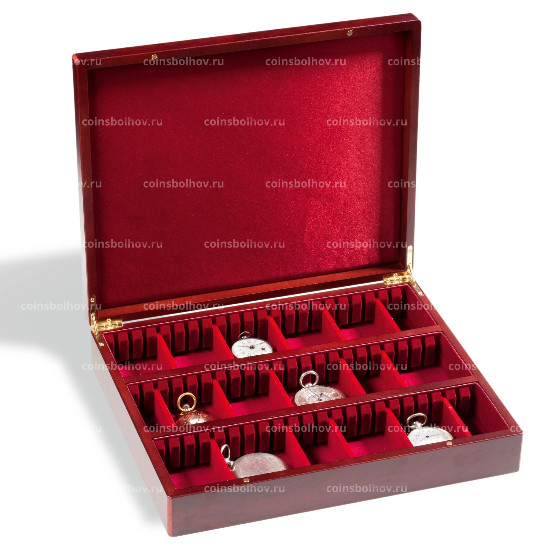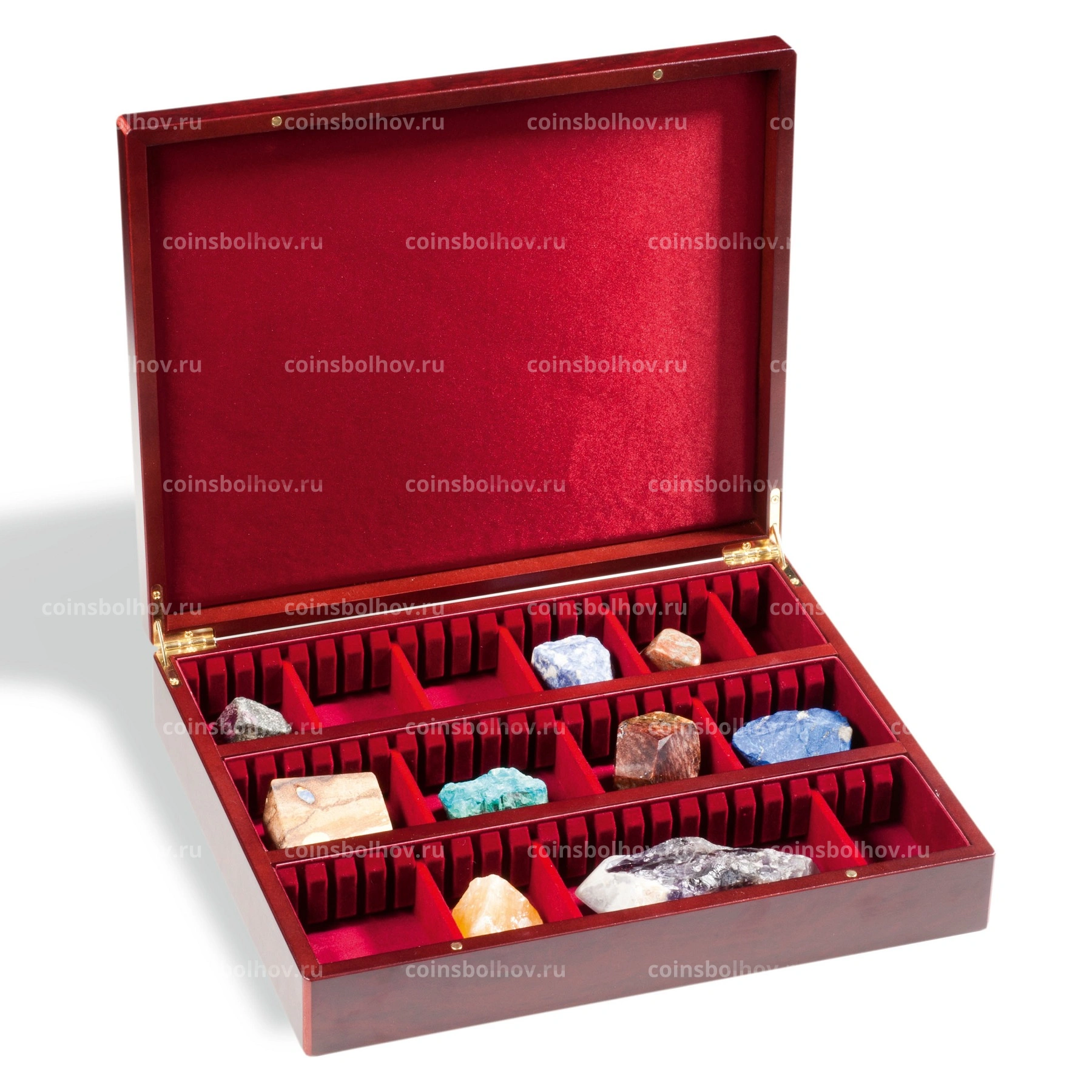 Отделка под красное дерево. Наружный формат: 330х270х65. Для хранения орденов, карманных часов, минералов и мн.др. Изменяемая классификация ячеек благодаря 2 фиксированным и 15 переставляемым перегородкам. Ширина ячеек 60 мм, изменяемая длина ячеек от 10 до 310 мм, высота ячеек 40 мм.