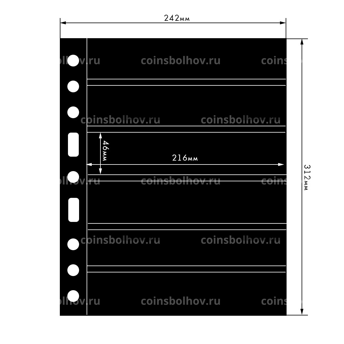Двухсторонние черные листы S для банкнот формата «Гранд» (242х312 мм). Изготовлены из высококачественного синтетического материала (полиэстера), который хорошо сохраняет форму и не содержит химических смягчителей и кислот.