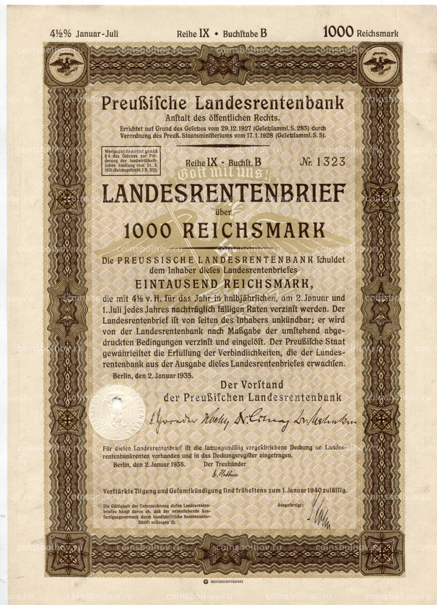 Облигация 4,5% 1000 рейхсмарок 1935 года Германия