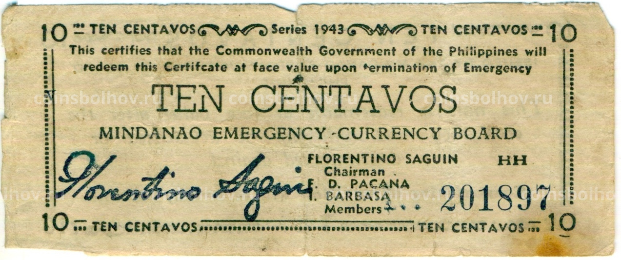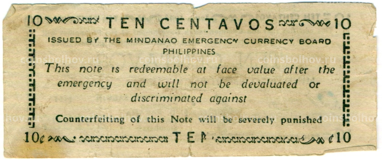Банкнота 10 сентаво 1943 года Филиппины (Минданао, Администрация США)