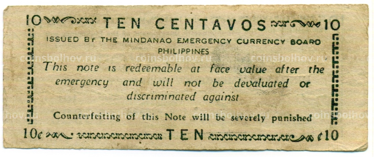 Банкнота 10 сентаво 1943 года Филиппины (Минданао, Администрация США)