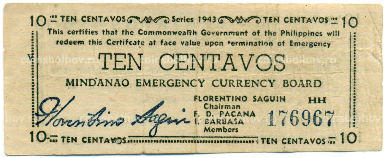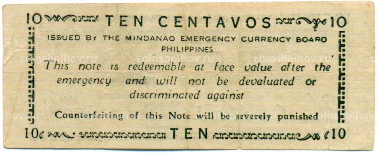 Банкнота 10 сентаво 1943 года Филиппины (Минданао, Администрация США)