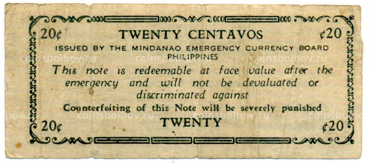 Банкнота 20 сентаво 1943 года Филиппины (Минданао, Администрация США)