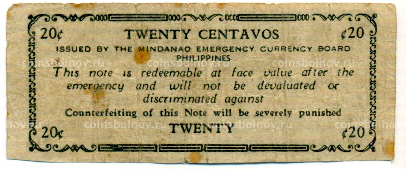 Банкнота 20 сентаво 1943 года Филиппины (Минданао, Администрация США)