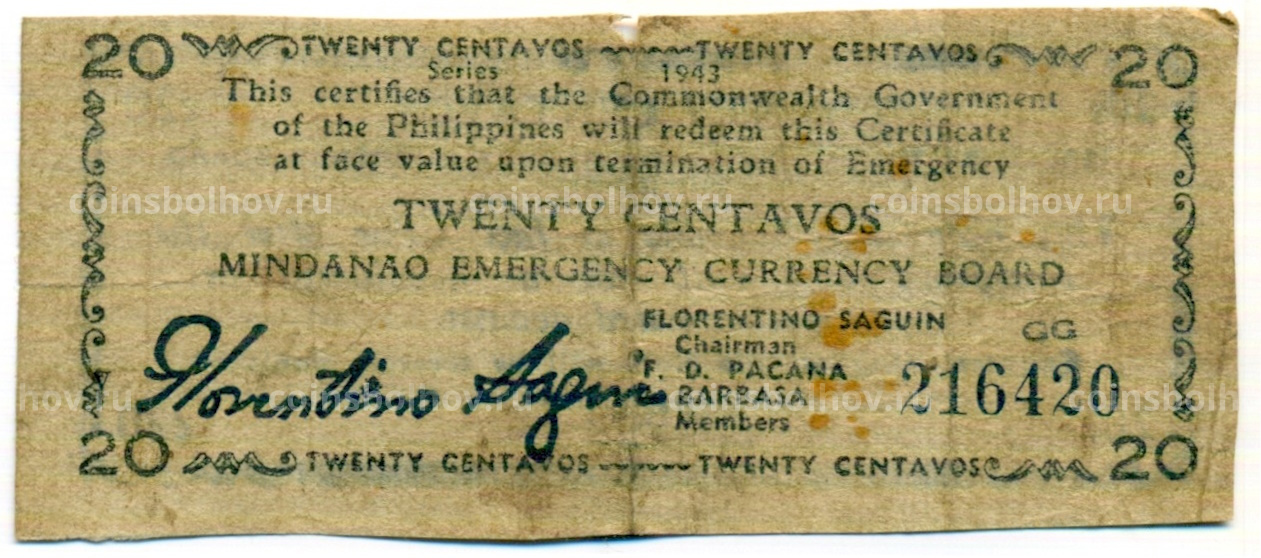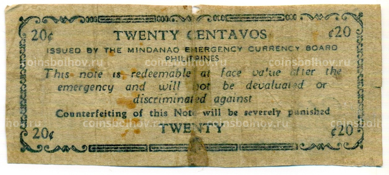 Банкнота 20 сентаво 1943 года Филиппины (Минданао, Администрация США)