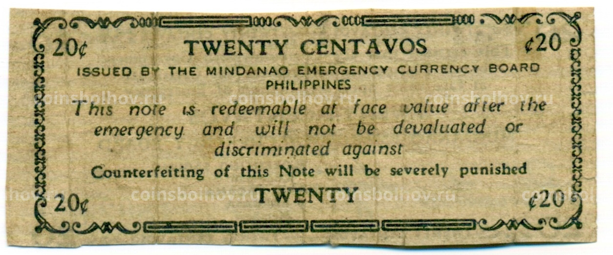 Банкнота 20 сентаво 1943 года Филиппины (Минданао, Администрация США)