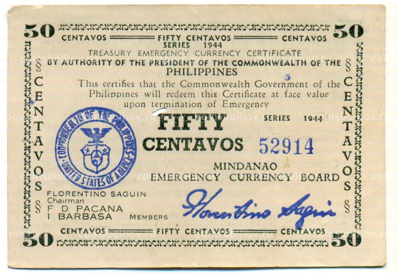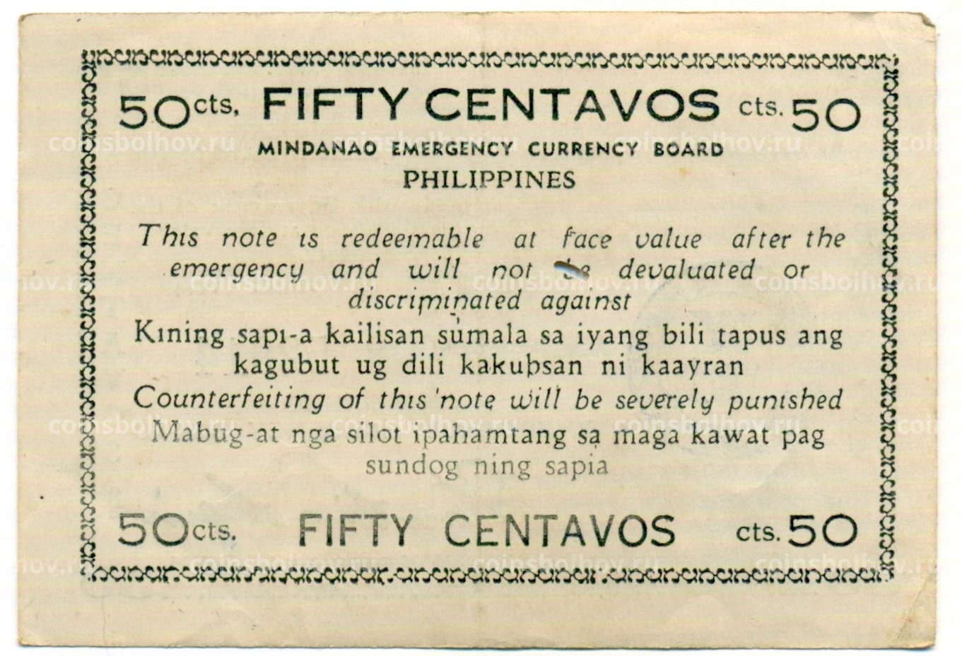 Банкнота 50 сентаво 1944 года Филиппины (Минданао, Администрация США)