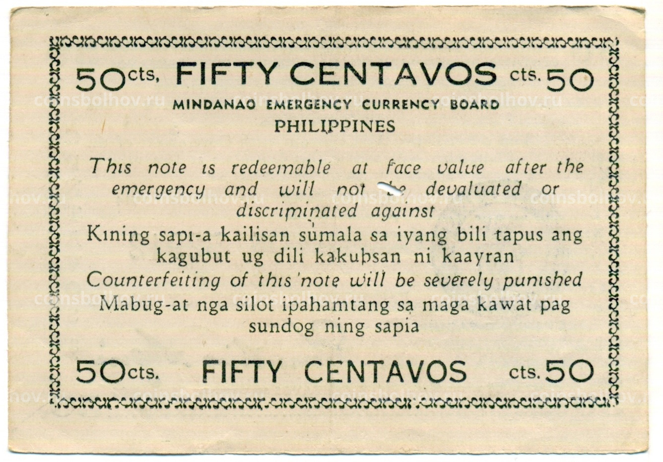 Банкнота 50 сентаво 1944 года Филиппины (Минданао, Администрация США)