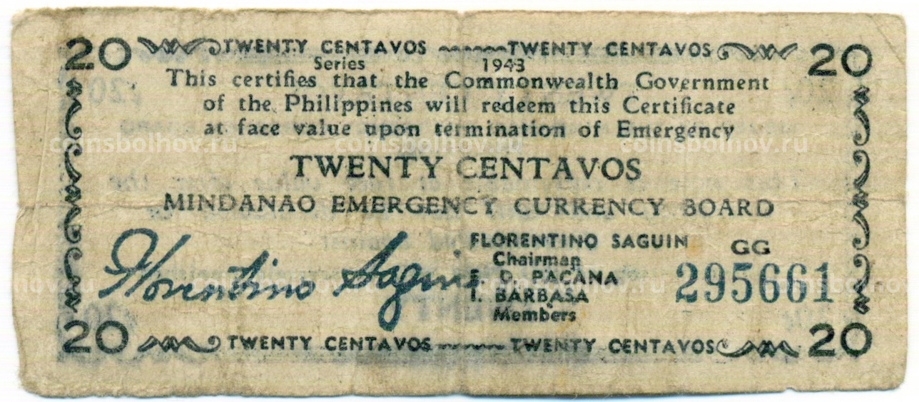 Банкнота 20 сентаво 1943 года Филиппины (Минданао, Администрация США)