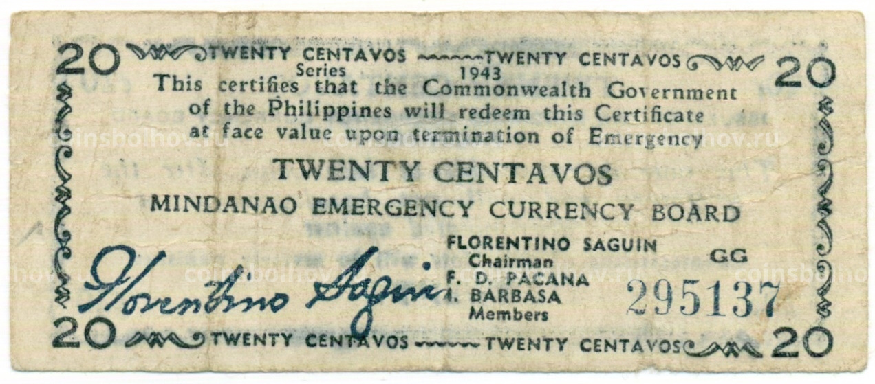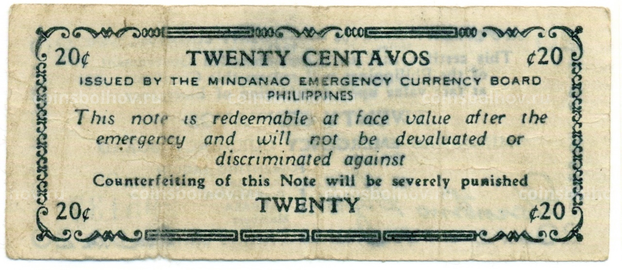 Банкнота 20 сентаво 1943 года Филиппины (Минданао, Администрация США)
