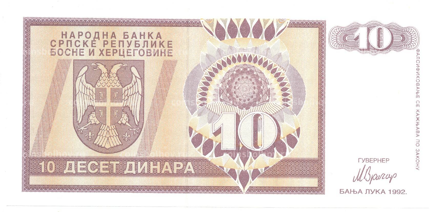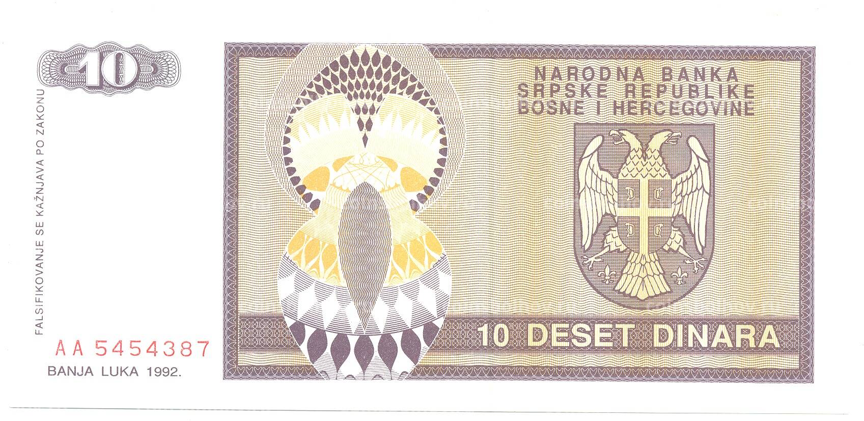 Банкнота 10 динаров 1992 года Босния и Герцеговина (Республика Сербская)