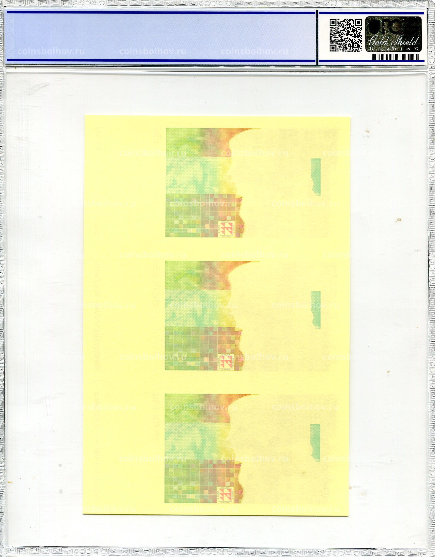 5 куна 1993(1994) года Хорватия (в слабе PCGS Gem UNC 68) — неразрезанный лист, пробный