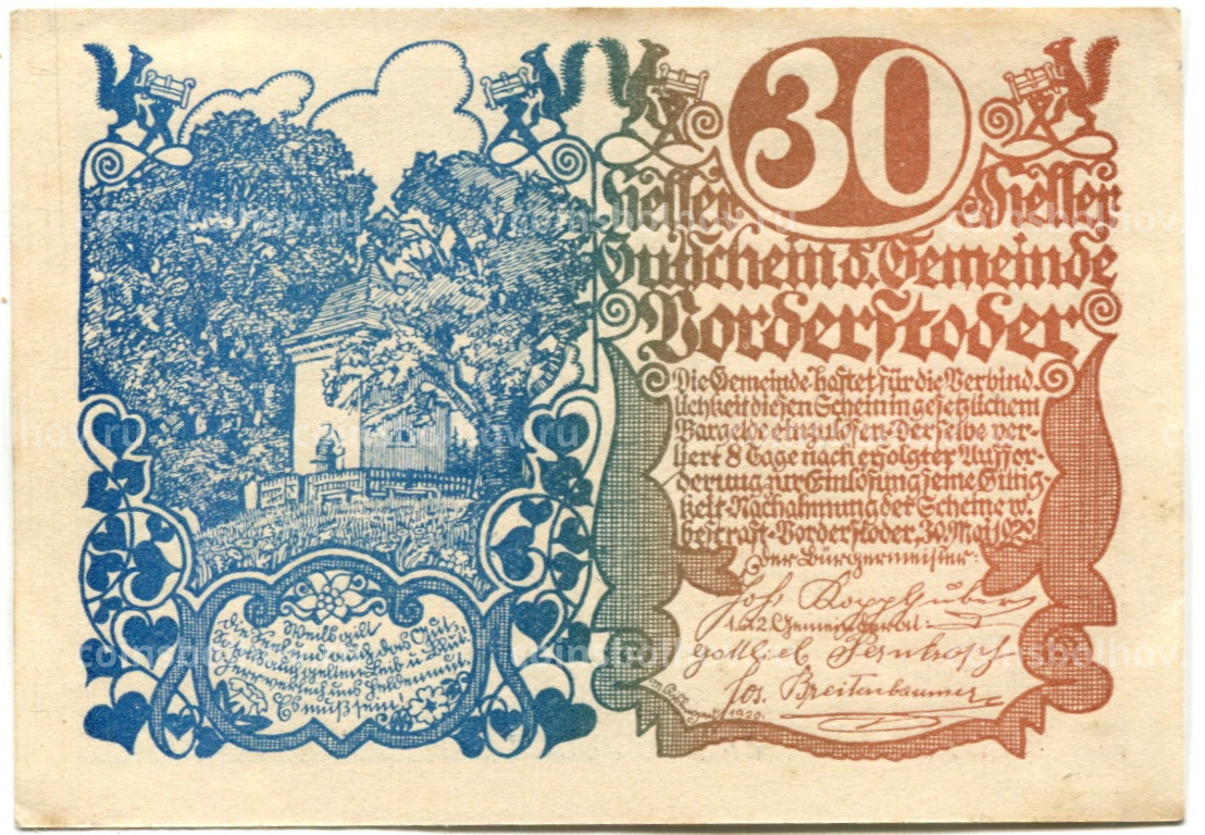 30 геллеров 1920 года Австрия — Фордерштойдер (нотгельд)