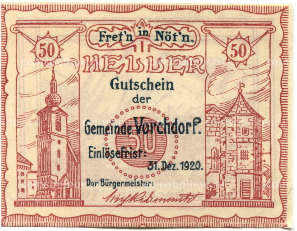 Банкнота 50 геллеров 1920 года Австрия — Форхдорф (нотгельд)