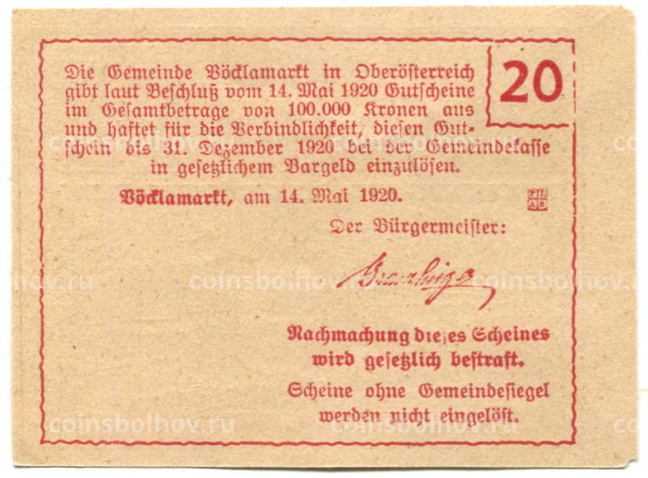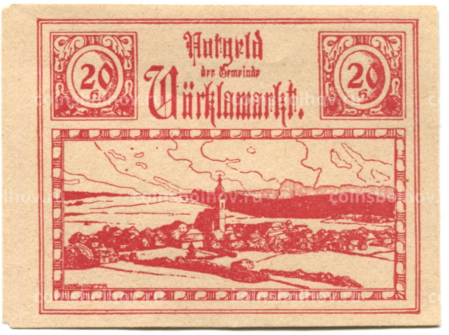 20 геллеров 1920 года Австрия — Фёлькермаркт(нотгельд)