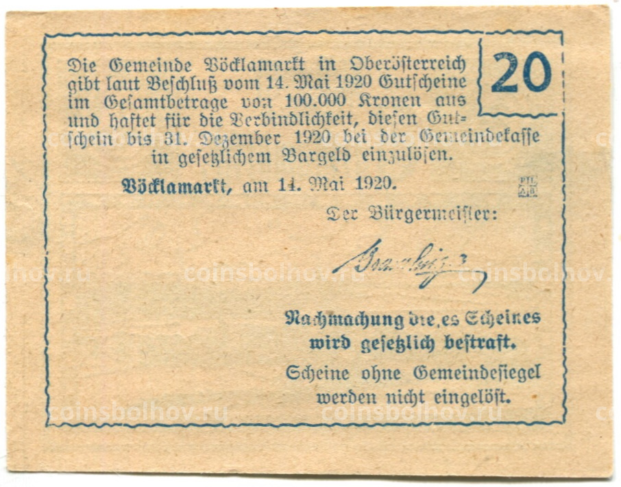 20 геллеров 1920 года Австрия — Фёлькермаркт(нотгельд)