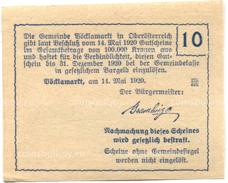 10 геллеров 1920 года Австрия — Фёлькермаркт(нотгельд)
