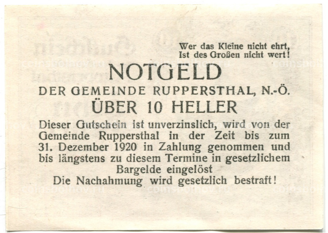 10 геллеров 1920 года Австрия — Руппершталь (нотгельд)