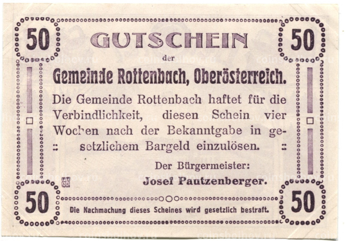 50 геллеров 1920 года Австрия — Роттенбах (нотгельд)