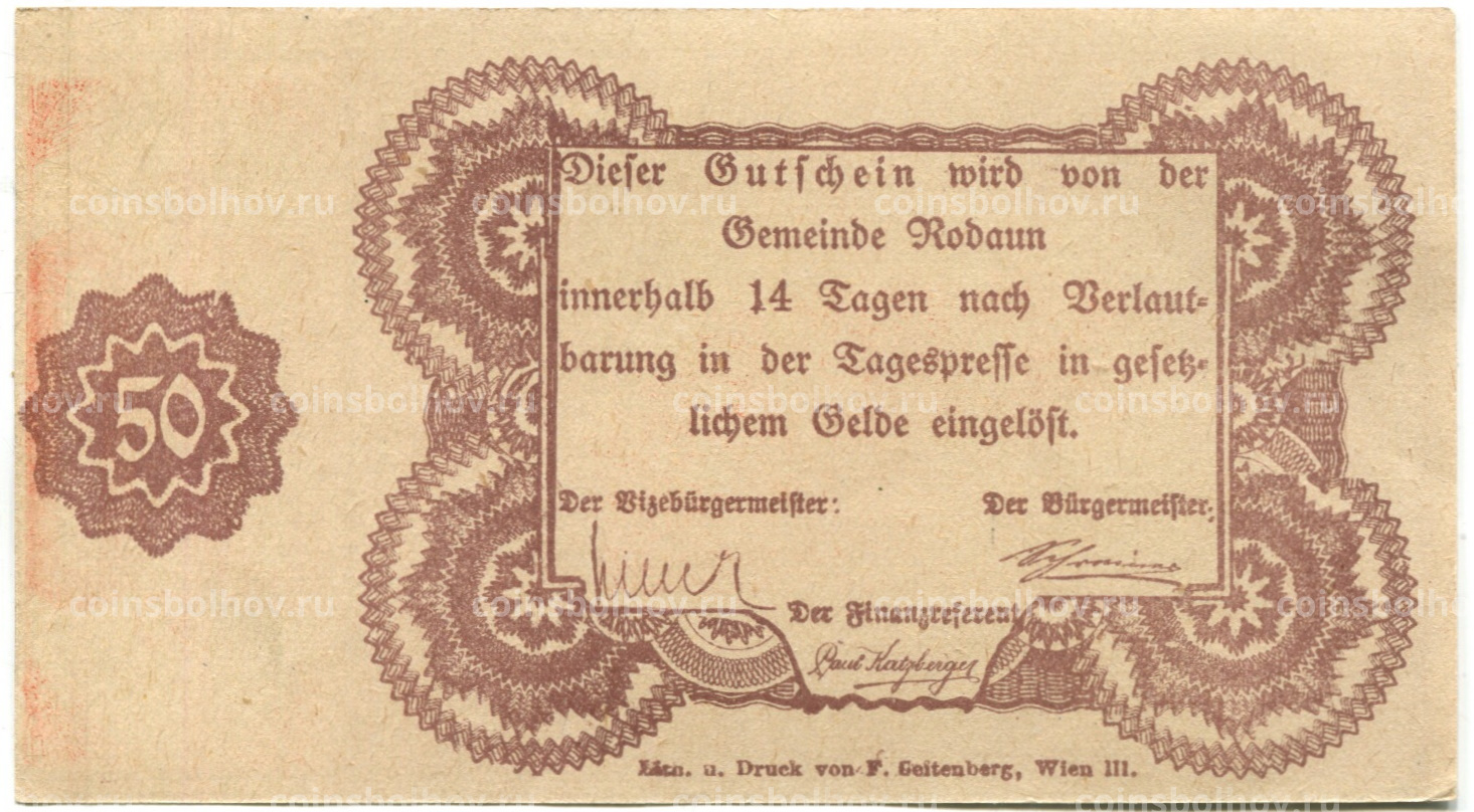 50 геллеров 1920 года Австрия — Родаун (нотгельд)