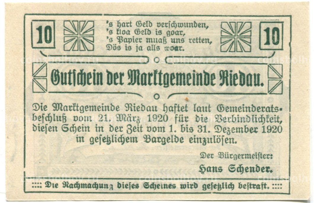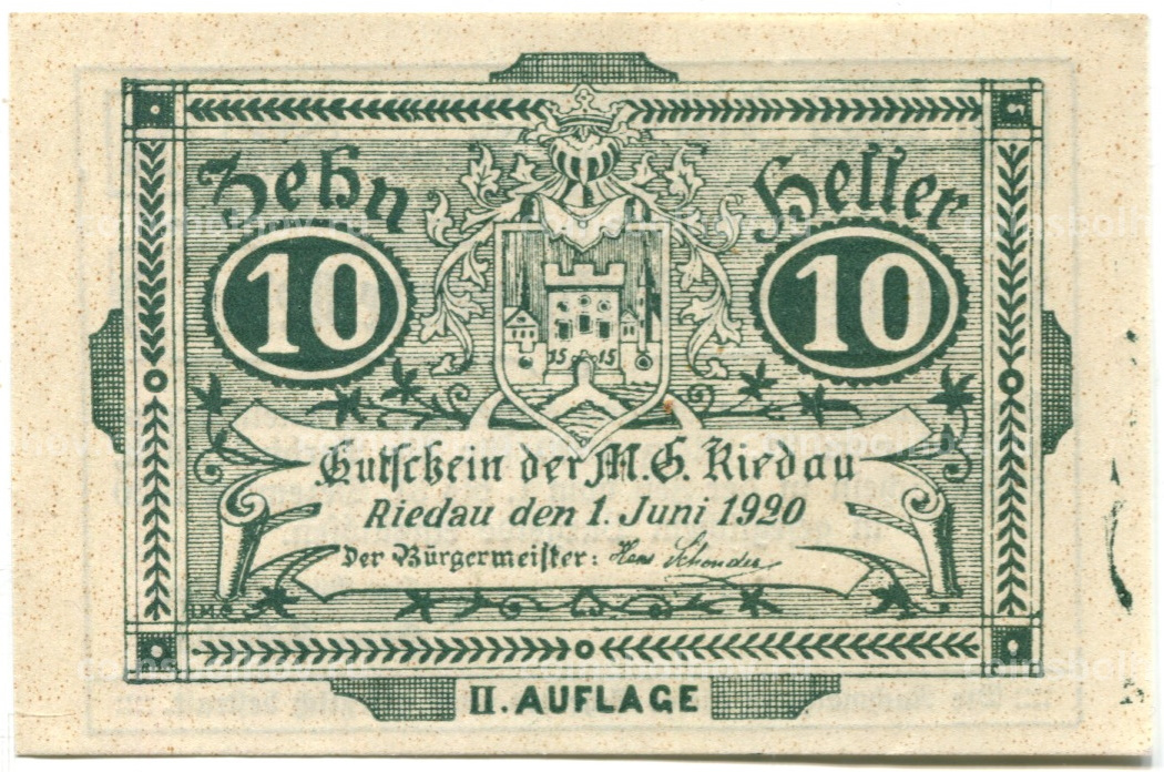 10 геллеров 1920 года Австрия — Ридау (нотгельд)