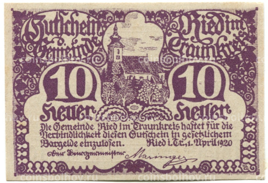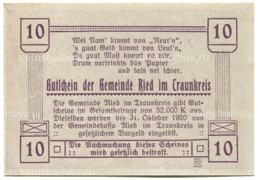 Банкнота 10 геллеров 1920 года Австрия — Рид-им-Траункрайс (нотгельд)