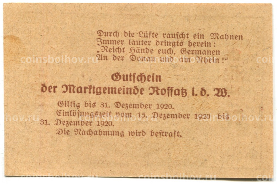 Банкнота 50 геллеров 1920 года Австрия — Россац на Дунае (нотгельд)