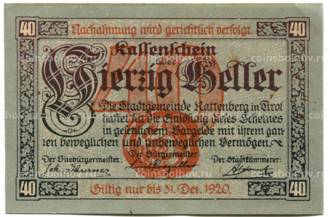 40 геллеров 1920 года Австрия — Раттенберг (нотгельд)