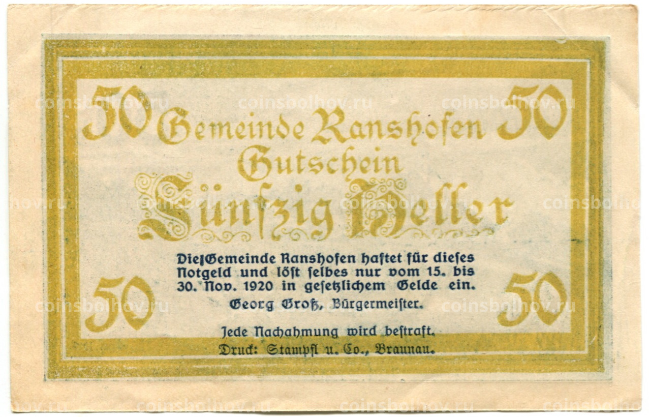 50 геллеров 1920 года Австрия — Рансхофен (нотгельд)