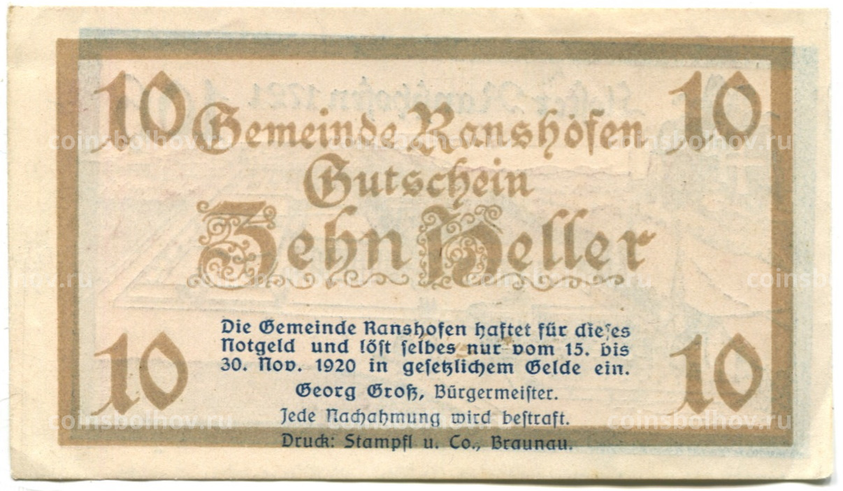10 геллеров 1920 года Австрия — Рансхофен (нотгельд)