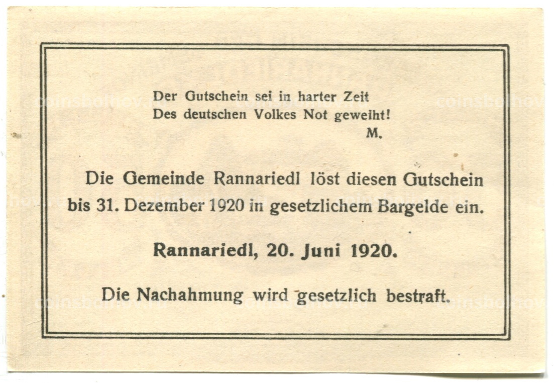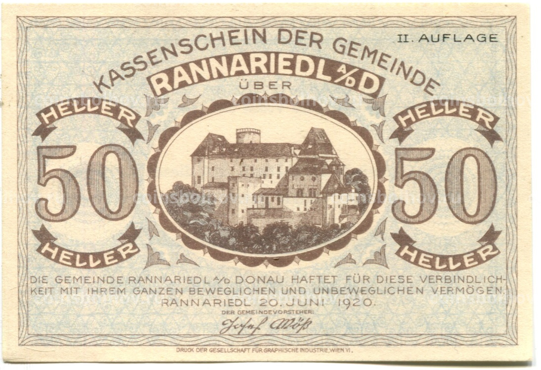 50 геллеров 1920 года Австрия — Раннариедль (нотгельд)