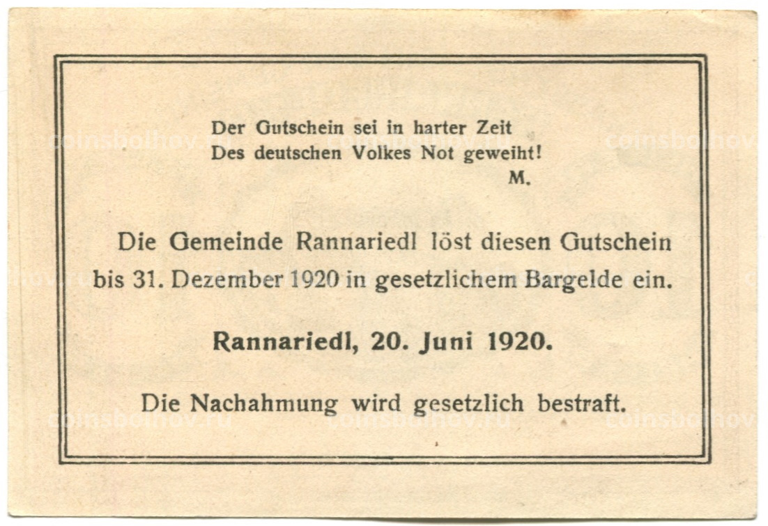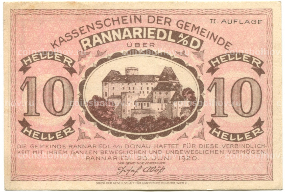 10 геллеров 1920 года Австрия — Раннариедль (нотгельд)