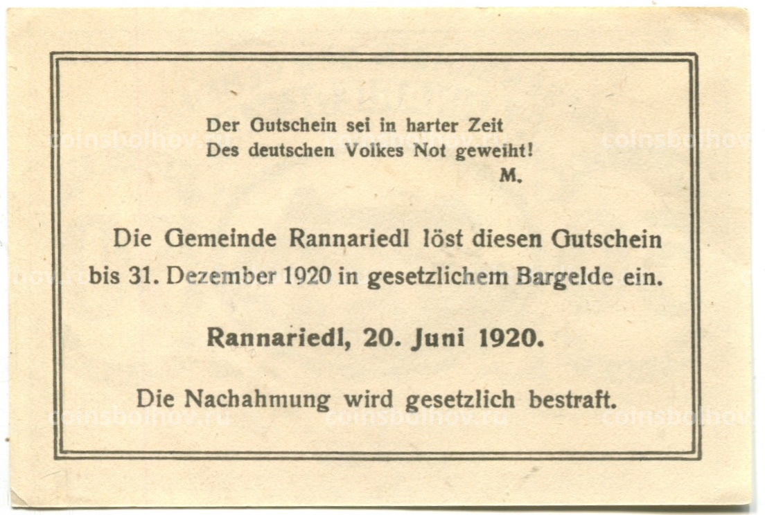 50 геллеров 1920 года Австрия — Раннариедль (нотгельд)