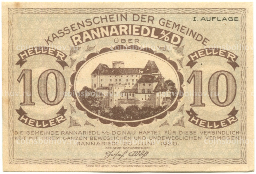 10 геллеров 1920 года Австрия — Раннариедль (нотгельд)