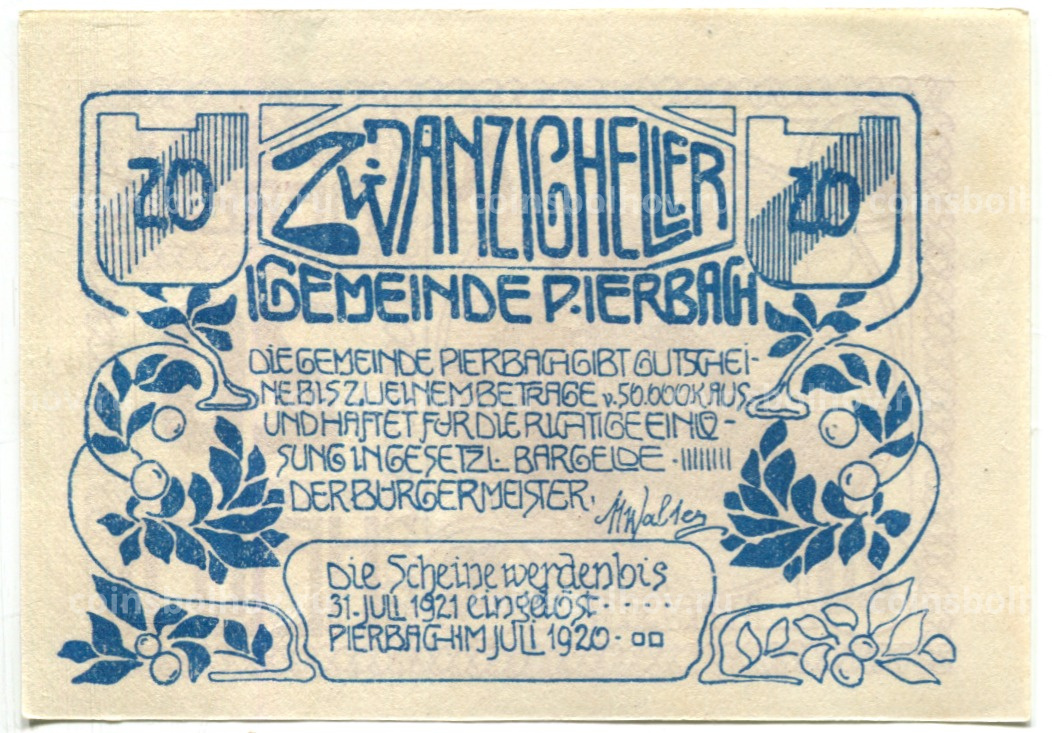 20 геллеров 1920 года Австрия — Пирбах (нотгельд)