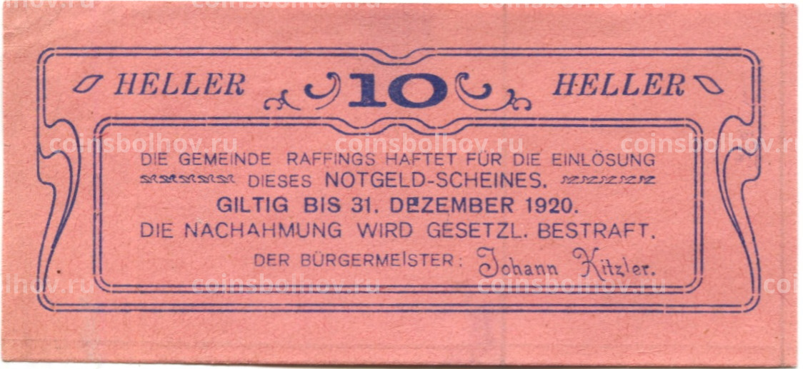 10 геллеров 1920 года Австрия — Раффингс (нотгельд)