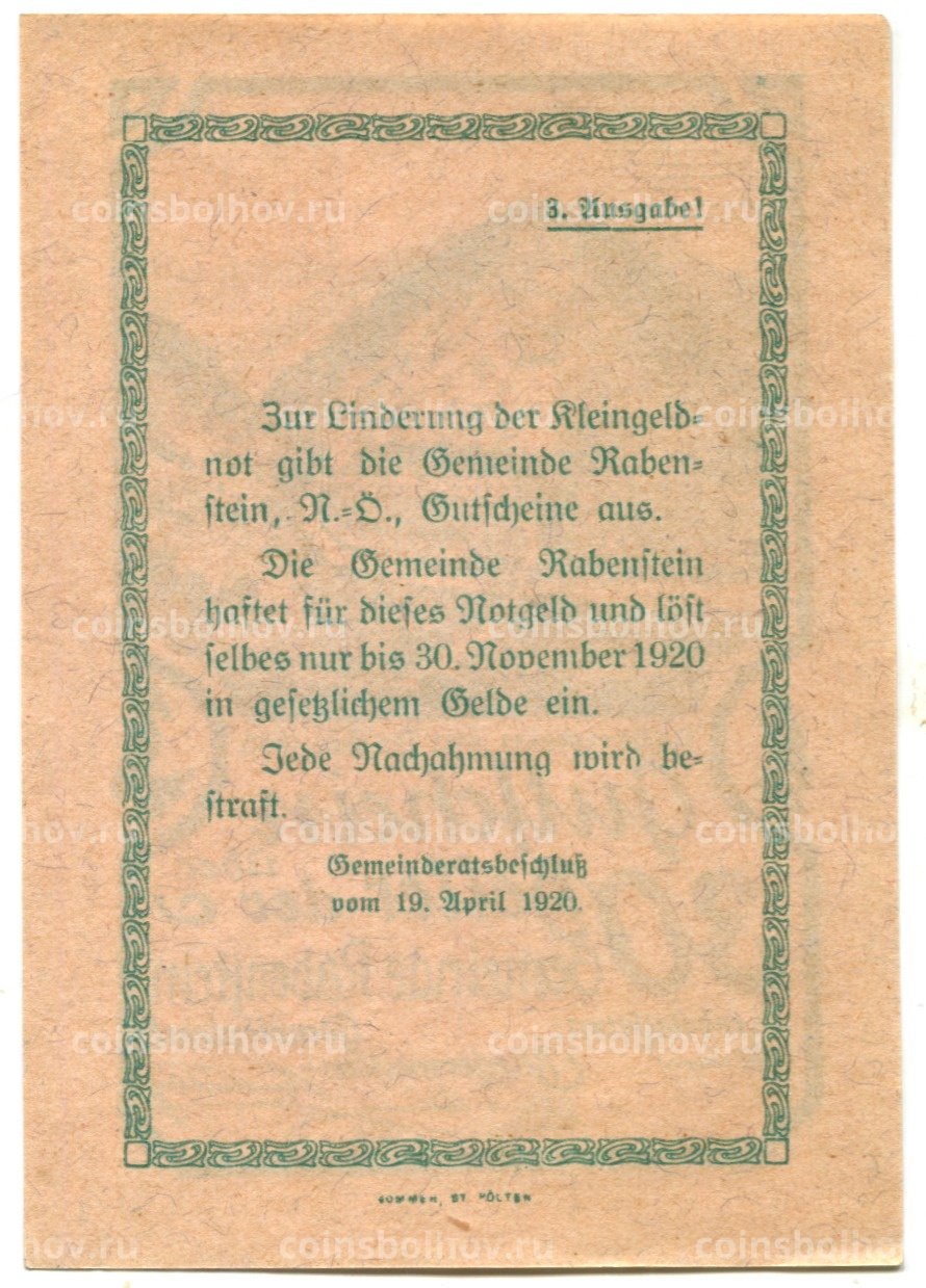 30 геллеров 1920 года Австрия — Рабенштайн (нотгельд)