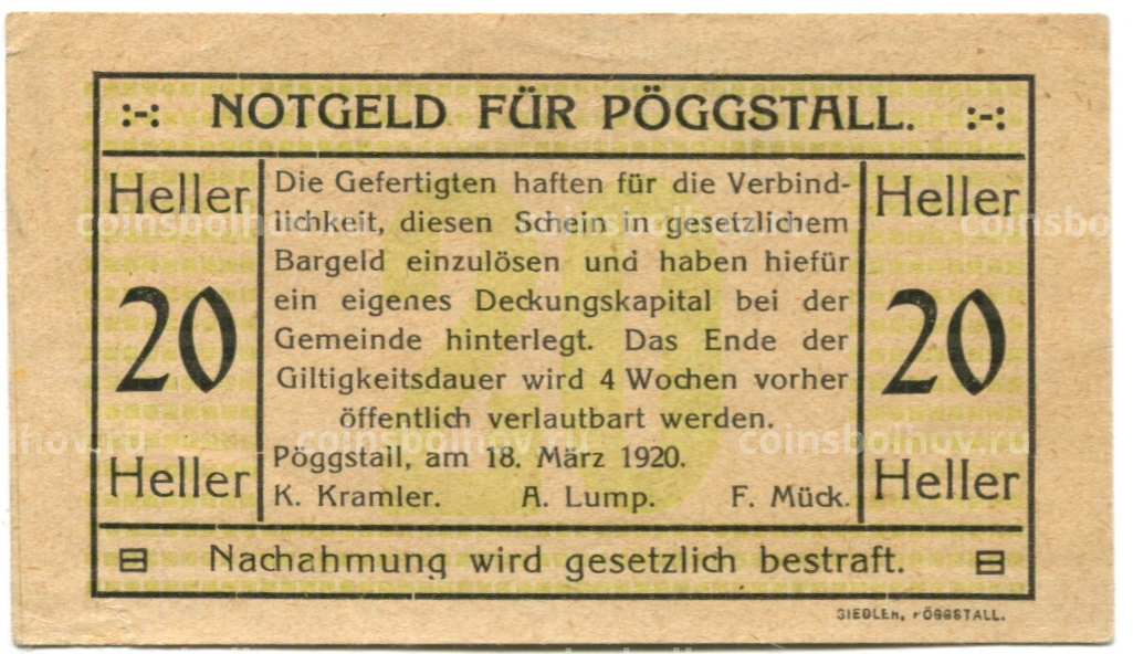 20 геллеров 1920 года Австрия — Пёггшталь (нотгельд)