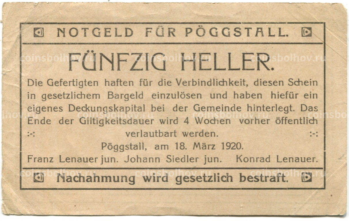 50 геллеров 1920 года Австрия — Пёггшталь (нотгельд)