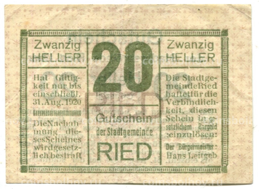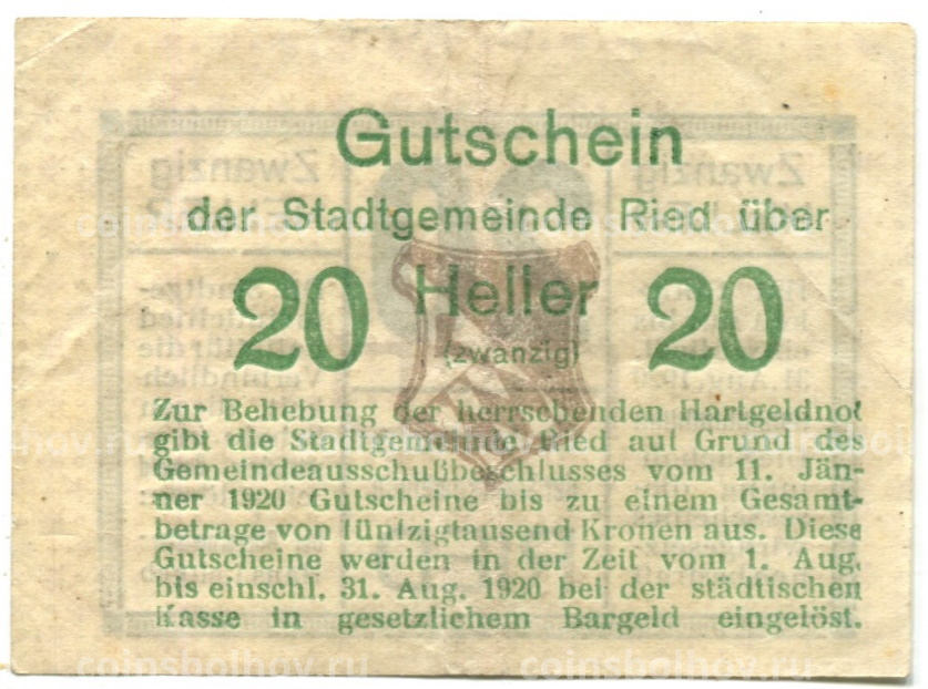 20 геллеров 1920 года Австрия — Рид (нотгельд)