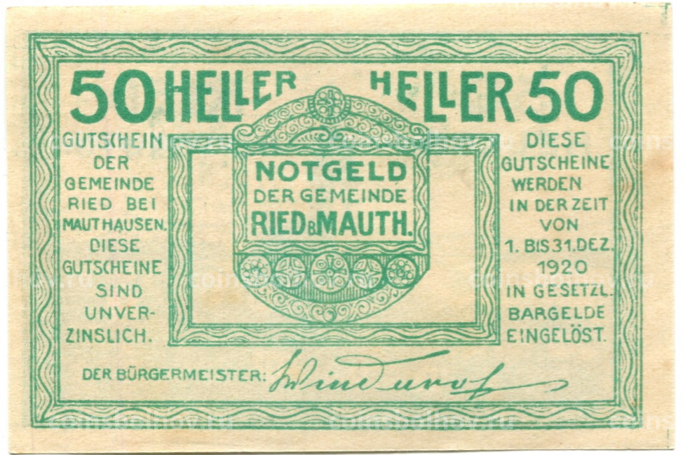 Банкнота 50 геллеров 1920 года Австрия — Рид-бай-Маутхаузен (нотгельд)