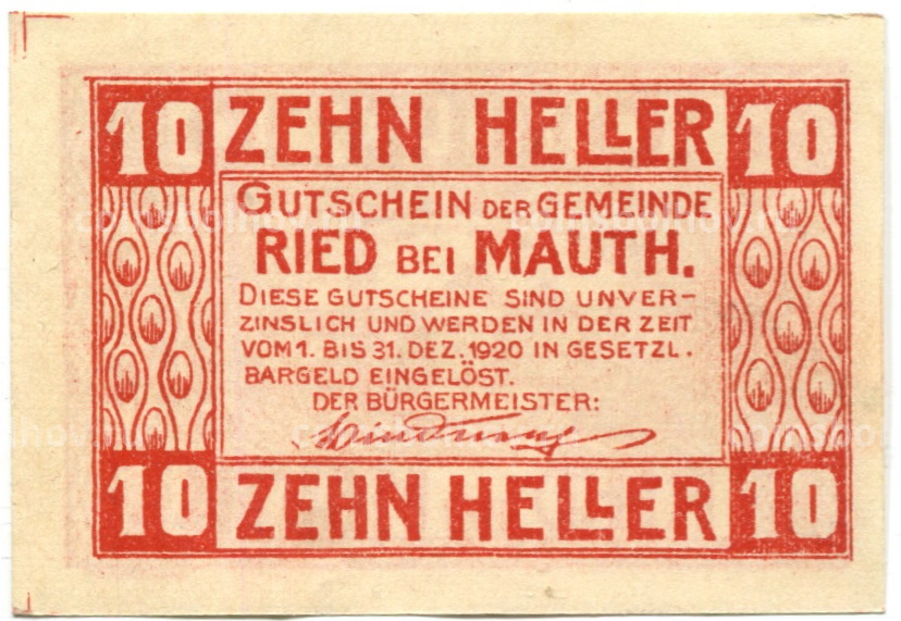 Банкнота 10 геллеров 1920 года Австрия — Рид-бай-Маутхаузен (нотгельд)