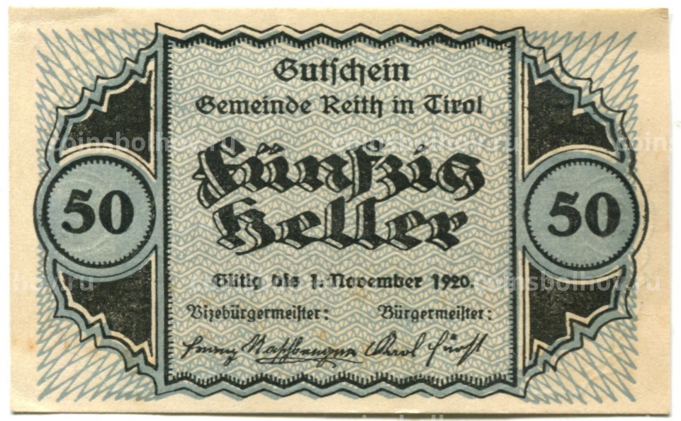 50 геллеров 1920 года Австрия — Райт(нотгельд)