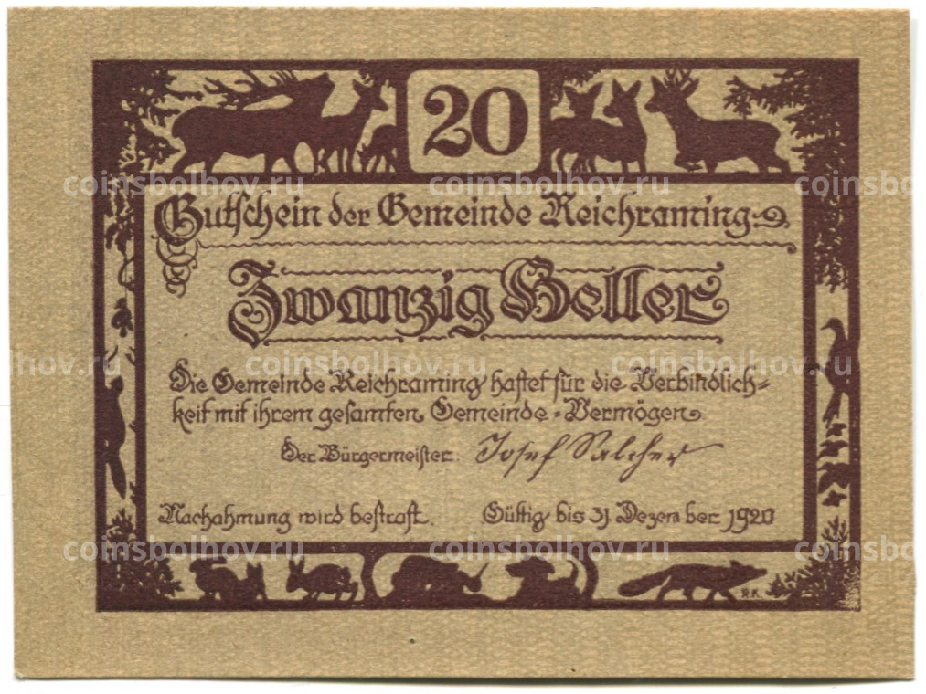 20 геллеров 1920 года Австрия — Рейхрейминг (нотгельд)